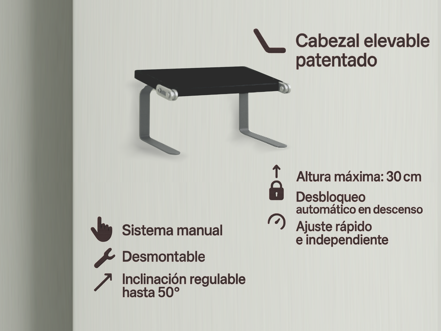- Cabezales Elevables Patentados: Ajuste manual rápido e independiente para facilitar la lectura y el descanso. Articulación: Graduable hasta 50º de inclinación y 30cm de altura. Cuando llega a la posición final más alta se "desbloquea" para bajarlo hasta la posición horizontal.