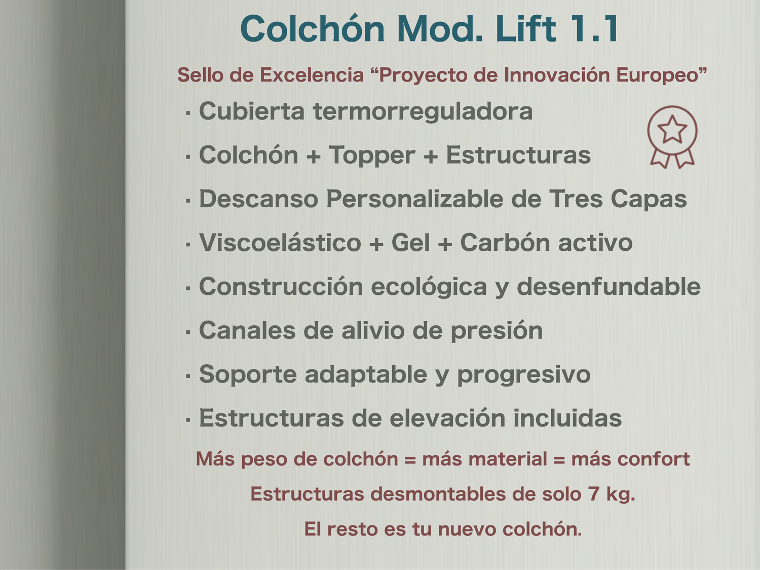 - "El secreto está en el peso: más material, más confort. ¡Compáralos!" Nuestras estructuras desmontables pesan solo 7kg, todo lo demás... es tu nuevo colchón.